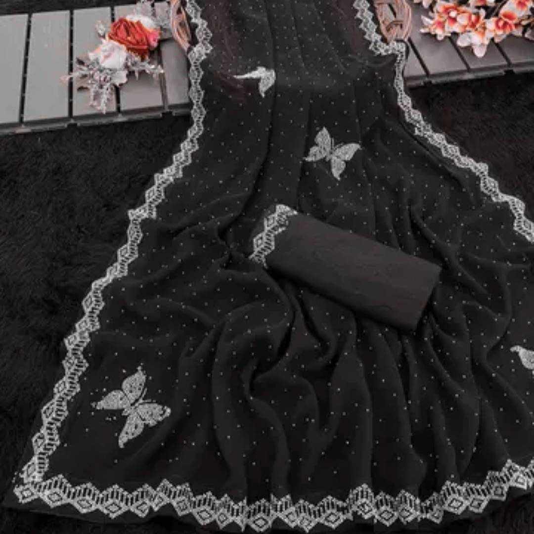 | Name : | S4s Black Siroski Butterfly Stones Lace Georgette Party Wear Saree |