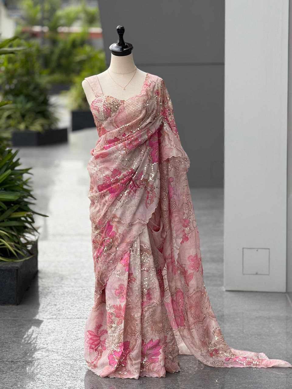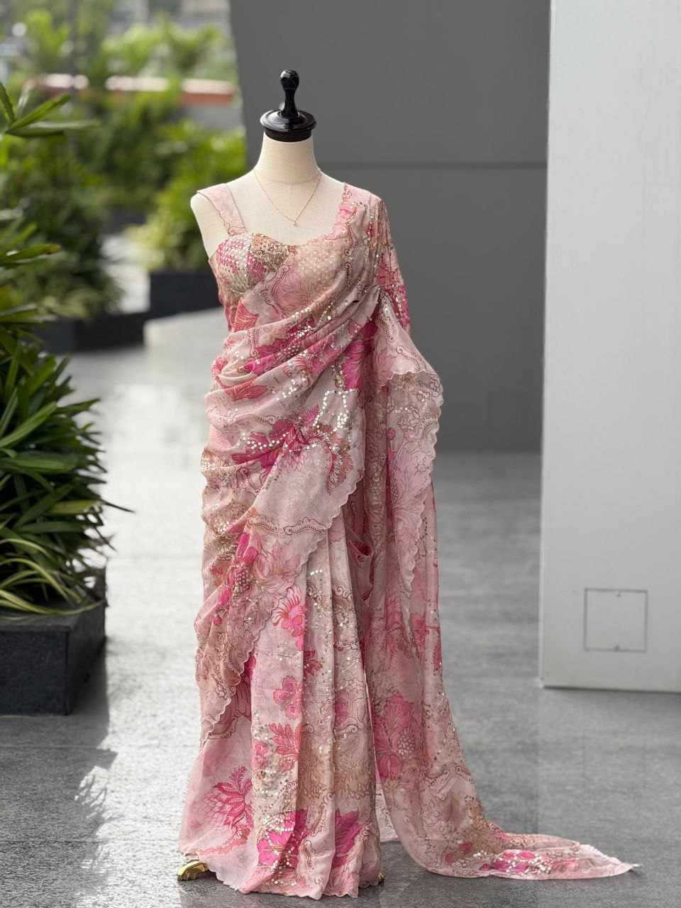 Saree – Pure Jimmy Organza digital printed saree adorned with elegant sequins work for a graceful look
